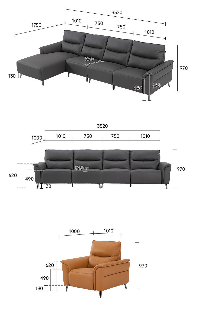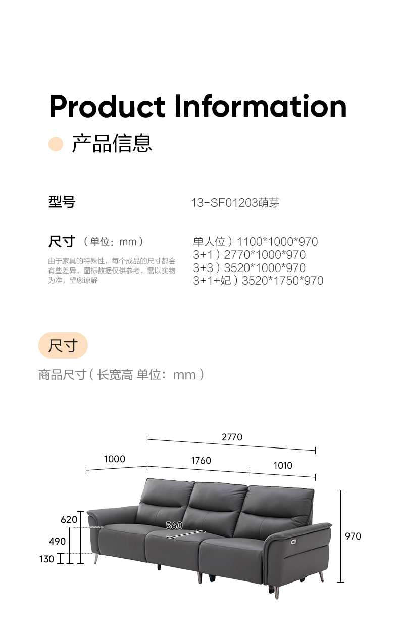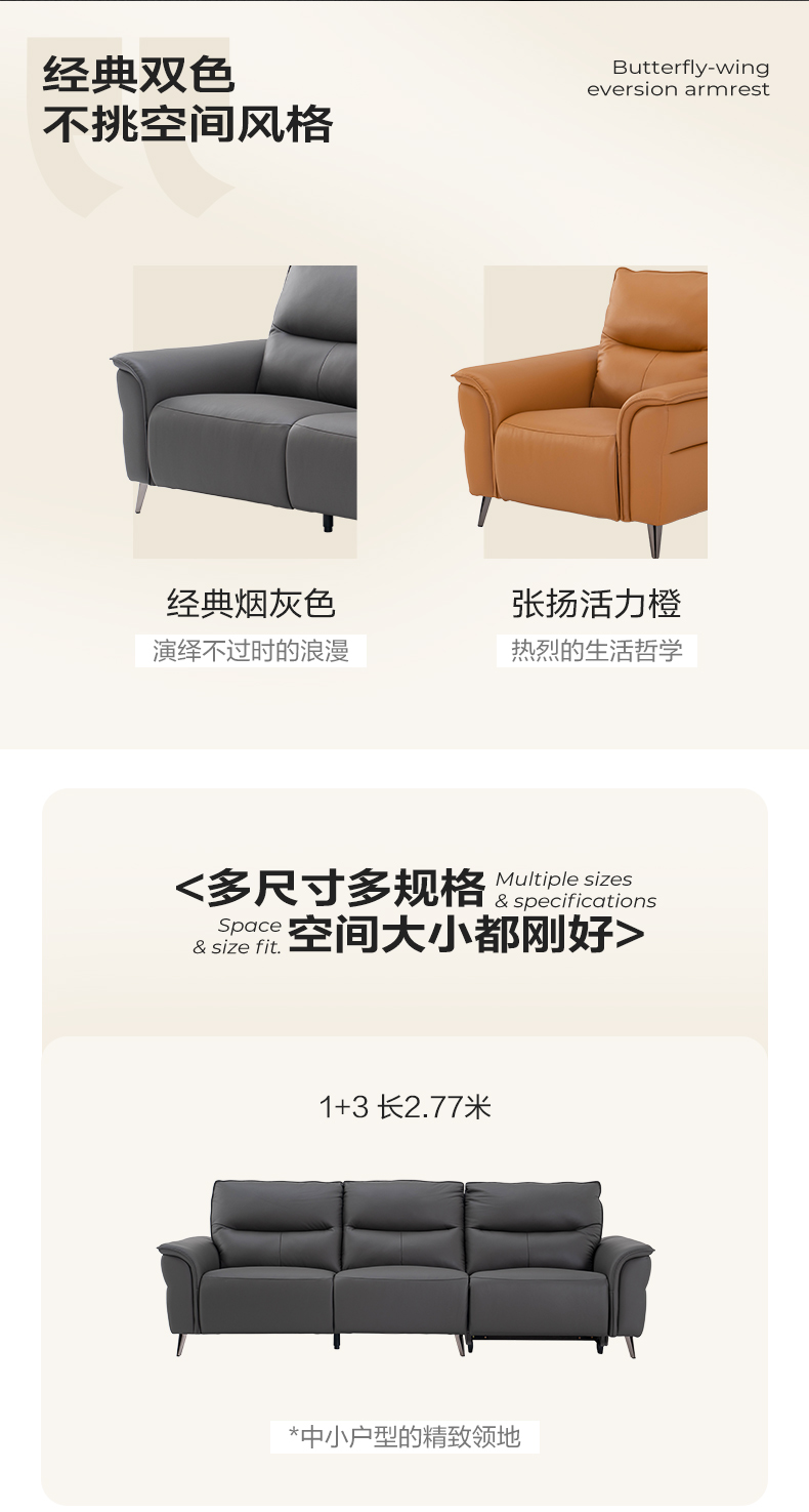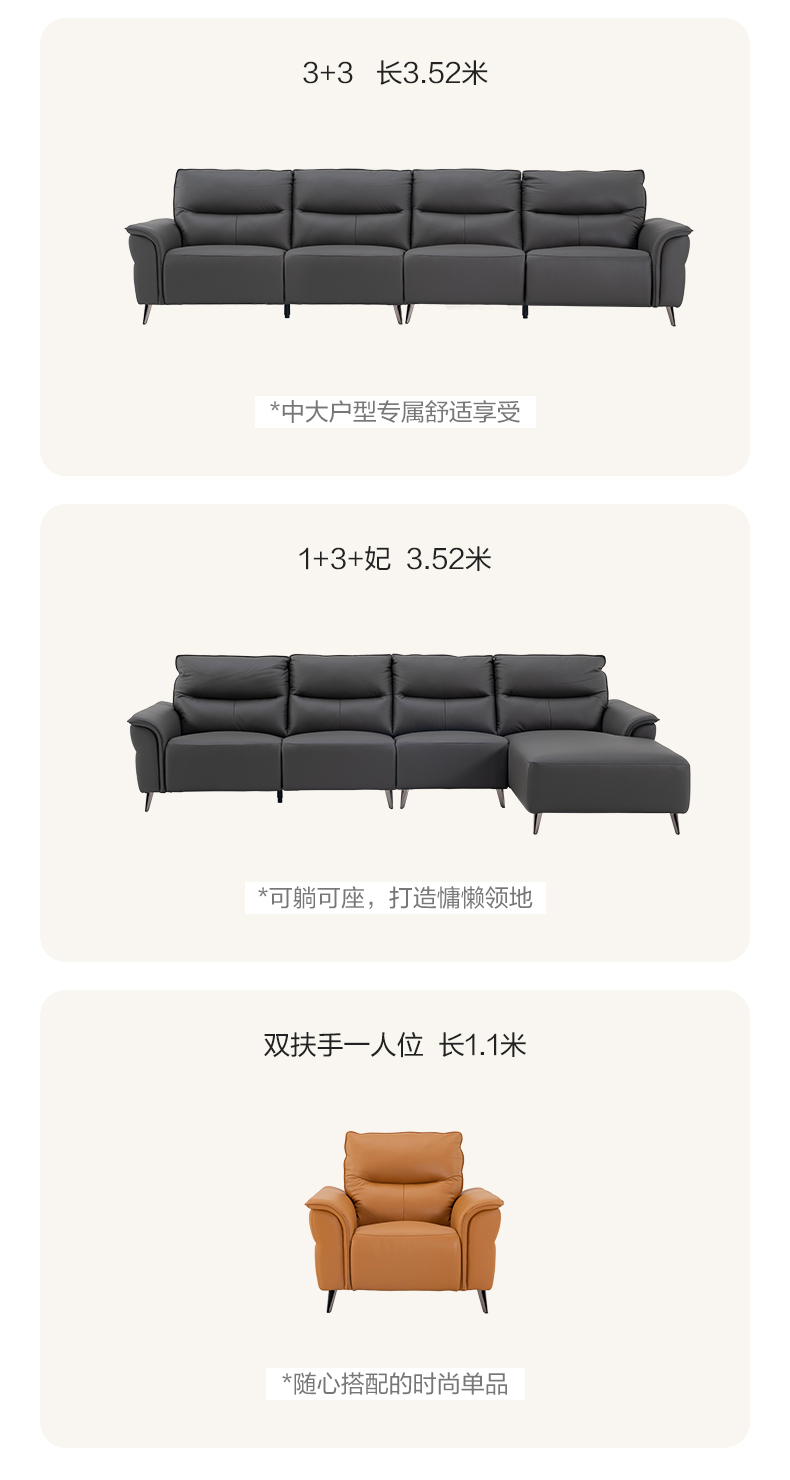 1+3 长2.77米,中小户型的精致领地;3+3规格 长3.52米,中大户型专属舒适享受;1+3+妃 3.52米 可躺可座,打造慵懒领地;双扶手一人位 长1.1米,随心搭配的时尚单品。